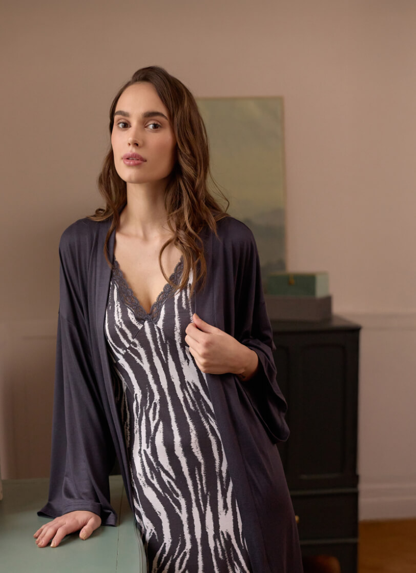 Bade mantil za žene u tamno sivoj boji dio je kolekcije Black zebra. Izrađen je većinski od viskoze što ga čini prijatnim i laganim za nošenje, a mali udio elastina doprinosi većoj udobnosti. Posjeduje pojas koji bade mantilu daje na atraktivnosti i boljoj prilagodljivosti tijelu.