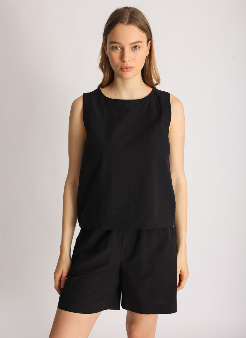 Ženska majica bez rukava u crnoj boji dio je Outwear programa. Sašivena je od kombinacije pamuka i lana što je čini udobnom i prijatnom za nošenje. Lako se uklapa sa drugim odjevnim djelovima.